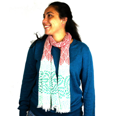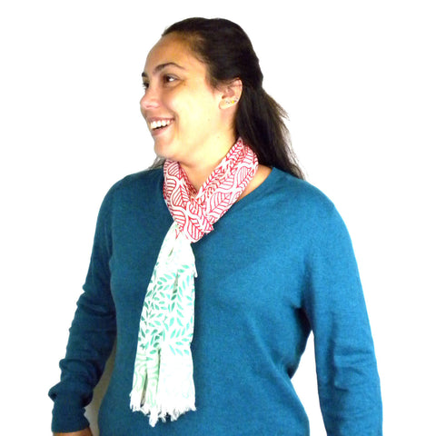 Red and Green Leaf Design Cotton Scarf Handmade and Fair Trade